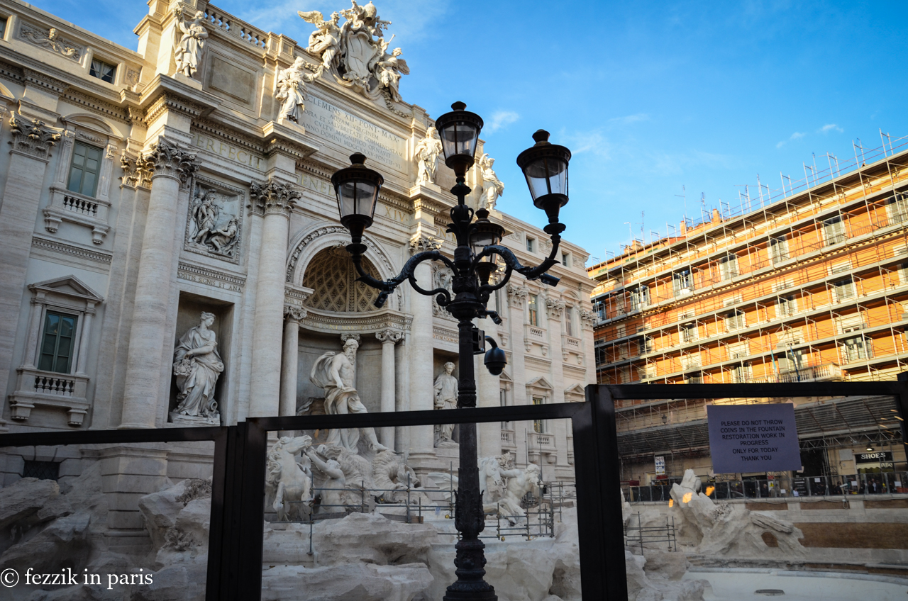 fezzikinparis-20151023-DSC_4757 October 31, 2015 by geepgeepgeep | 0 comments Trevi Fountain was under construction, much to the consternation of the Purrito (chucking a coin over your shoulder and into the fountain supposedly means that you’ll return to Rome). I’ll request a waiver since it was under construction.